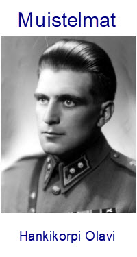 Olavi Armas Hankikorpi, olen syntynyt 2.2.18 Helsingissä. Olen isästäni orpo sikäli, että vuonna 1918, kun synnyin helmikuussa, niin isäni tapettiin Helsingissä maaliskuussa. Näinollen olen ollut isovanhempieni hoidossa Kärkölässä, jota sanon kotipitäjäkseni. Äitini oli liikkeenharjoittaja siihen aikaan. hänellä oli ns. silitysliike, jossa herrojen paitoja ja asuja laitettiin kuntoon. Isäni oli rautateiden palveluksessa. Äitini ei voinut minua pitää työnsä takia. Olen maaseudulla kasvanut siihen asti, kunnes menin armeijaan.